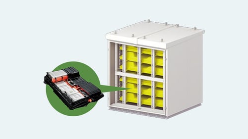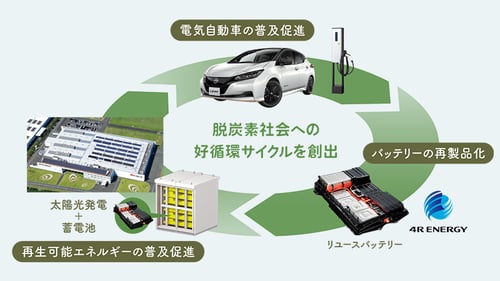 日産リーフのリユースバッテリーを使用することで製造工程でのCO2排出削減やレアメタルなどの資源再利用を行い、好循環なサーキュラーエコノミーを実現します。